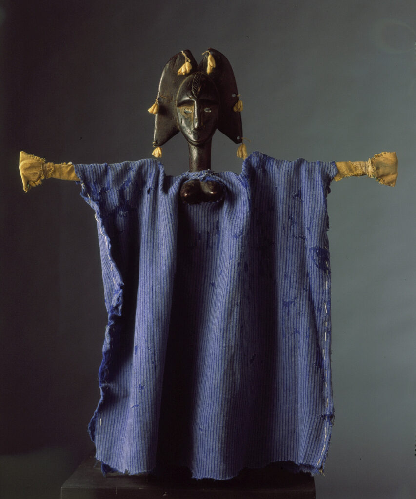 Matériaux : Bois à patine sombre, yeux en miroir, fils de coton bistre dans la coiffure, tissu